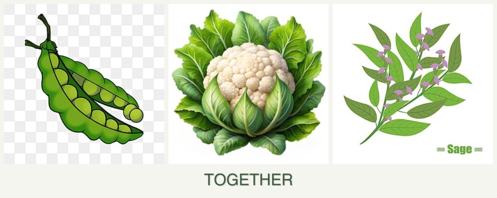 - Growth Requirements: Peas and cauliflower benefit from similar growth conditions, but sage prefers a drier environment.