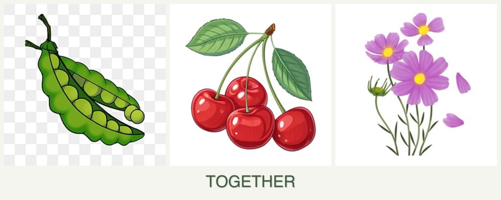 - Improved Growth: Peas enrich the soil with nitrogen, supporting the growth of cherries and cosmos.