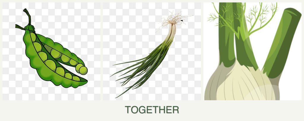 - Growth Requirements: Peas and chives have similar sunlight and water needs, while fennel requires more space and can tolerate poorer soil conditions.