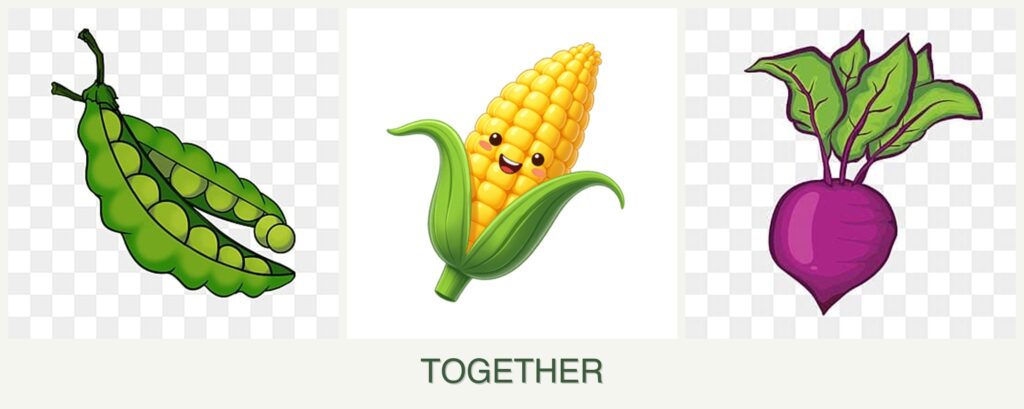 Nutrient Needs: Peas are nitrogen-fixers, which means they enrich the soil with nitrogen, benefiting the nitrogen-hungry corn. Beets, on the other hand, have moderate nutrient needs and won’t compete heavily with corn and peas.