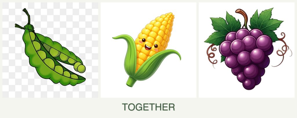 - Companion Plants: Peas pair well with carrots; corn with beans; grapes with herbs like basil.