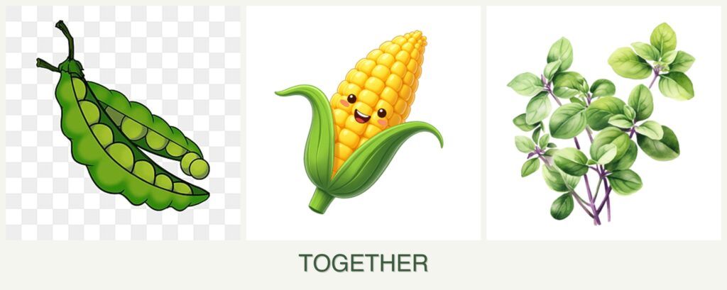 - Resource Competition: Corn’s high nutrient demands might outcompete peas and oregano if not managed.