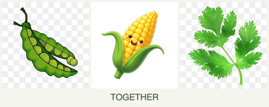 - Resource Competition: Corn’s high nutrient needs can compete with peas and parsley if not managed.