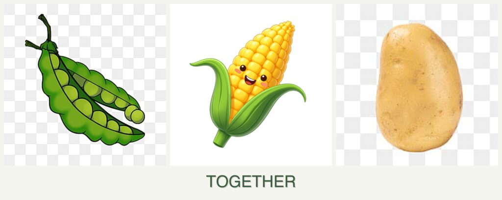 - Nutrient Needs: Peas enrich the soil with nitrogen, which benefits corn, but potatoes might compete for nutrients if not properly managed.