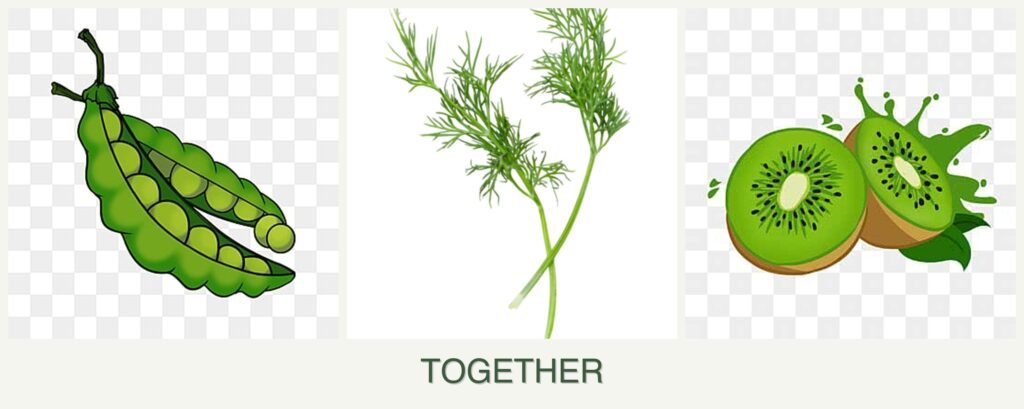 Kiwi: This plant requires warmer conditions, more space, and different soil and water needs compared to peas and dill. Kiwi vines can overshadow and compete with smaller plants like peas and dill, making them unsuitable companions.