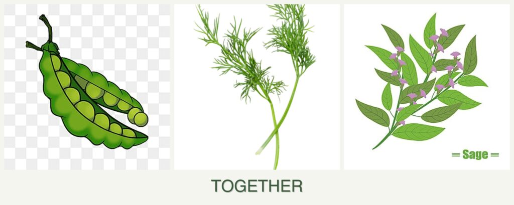 - Nutrient Needs: Peas add nitrogen to the soil, benefiting dill and sage, which do not require high nitrogen levels.