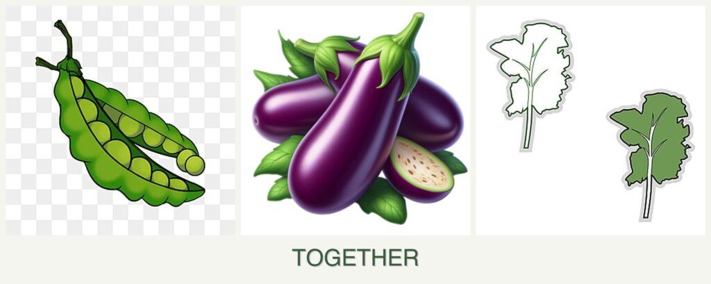 - Resource Competition: Eggplant’s high nutrient demand can overshadow peas and kale.