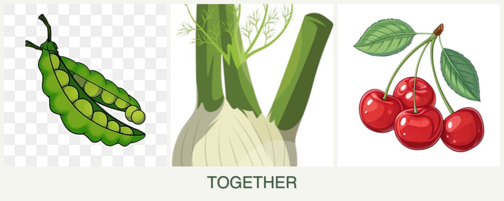 - Different Watering Needs: While peas and cherries align, fennel’s needs can diverge.