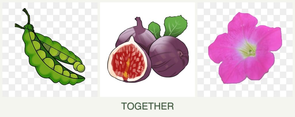 - Companion Plants: Peas pair well with carrots and radishes, figs with lavender, and petunias with tomatoes.