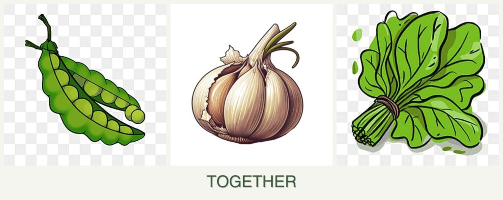 Spacing: With proper spacing, these plants can coexist without competing for resources. Garlic’s vertical growth habit allows it to fit well among the lower-growing peas and spinach.