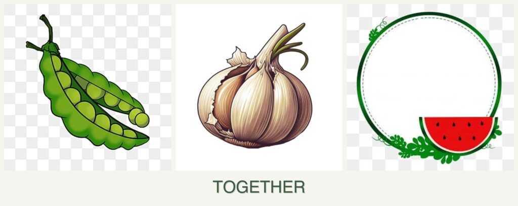Nutrient Needs and Spacing: Peas fix nitrogen in the soil, benefiting nearby plants, but watermelons need a lot of space to spread, which can overshadow peas and garlic.