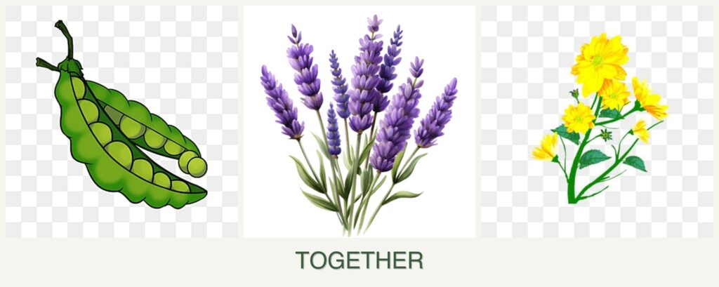 - Nutrient Needs: Peas enrich the soil with nitrogen, benefiting the nutrient needs of lavender and calendula.