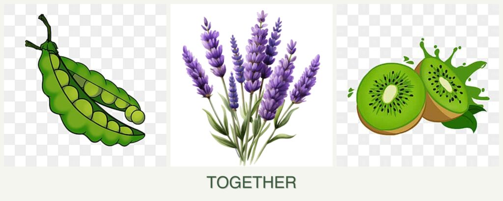 - Nutrient Needs: Peas are nitrogen-fixing plants that enrich the soil, but kiwi and lavender have different nutrient demands that may not align.