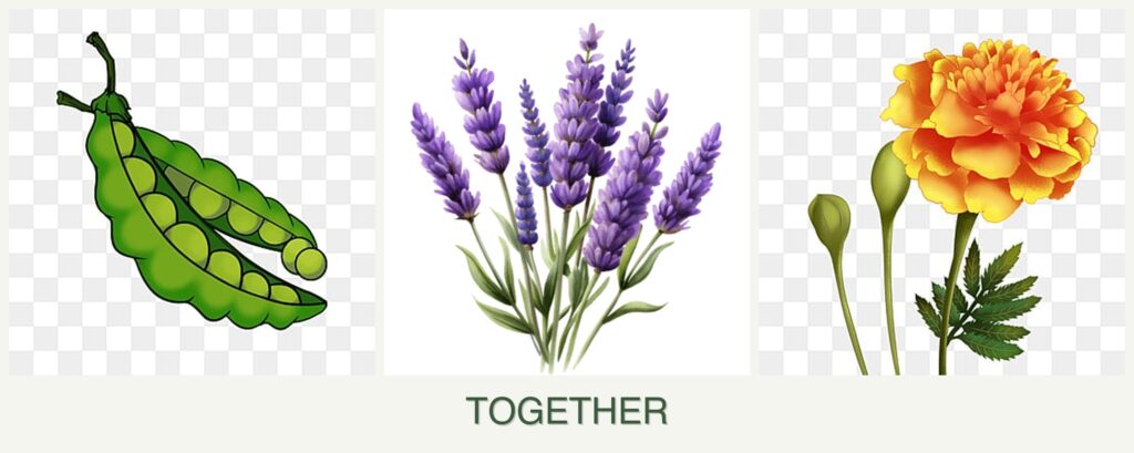 - Timing: Plant peas in early spring, and marigolds and lavender after the last frost.