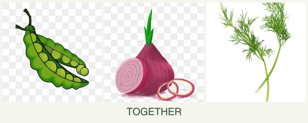 Growth Requirements: Peas, onions, and dill have similar sunlight and soil preferences, which makes them compatible in a shared space. Peas thrive in cool weather and provide nitrogen to the soil, benefiting the other plants.