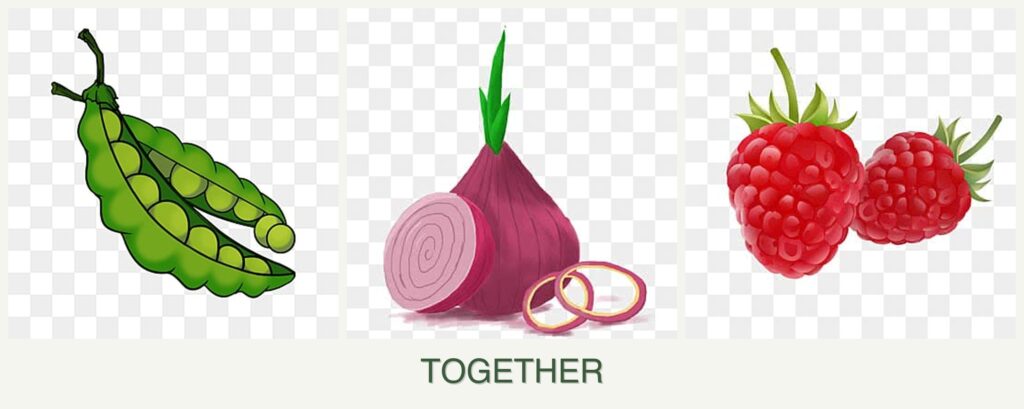 - Growth Requirements: Peas and onions have similar sunlight and soil needs, while raspberries require more space and a different soil pH.