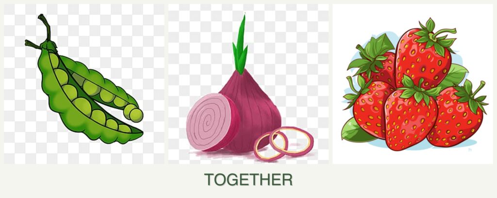 - Nutrient Needs: Peas fix nitrogen in the soil, benefiting onions and strawberries, which require nitrogen for healthy growth.