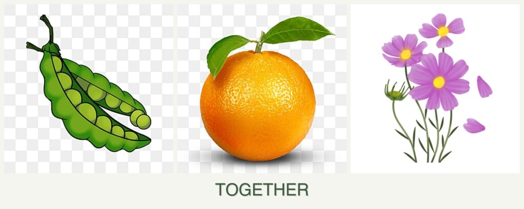 - Nutrient Needs: Peas are nitrogen-fixers, which can benefit some plants, but oranges require a more balanced nutrient profile, and cosmos do not significantly benefit from the nitrogen fixation.