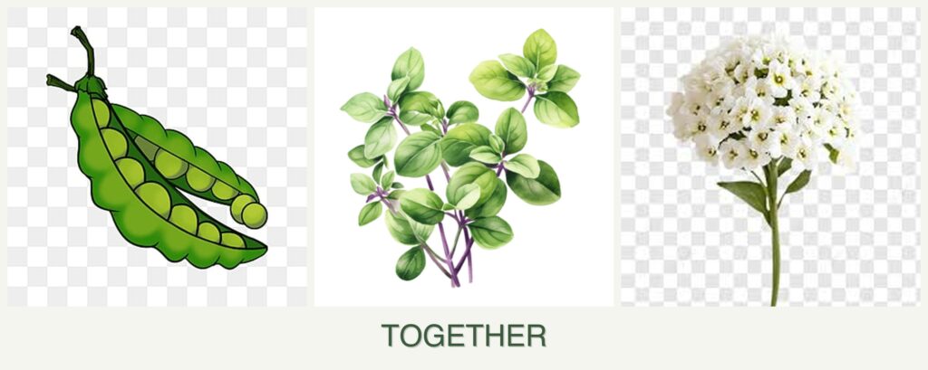 Nutrient Needs and Spacing: Peas are nitrogen-fixing plants, enriching the soil for neighboring plants. Oregano and alyssum have similar soil and spacing requirements, making them compatible companions.