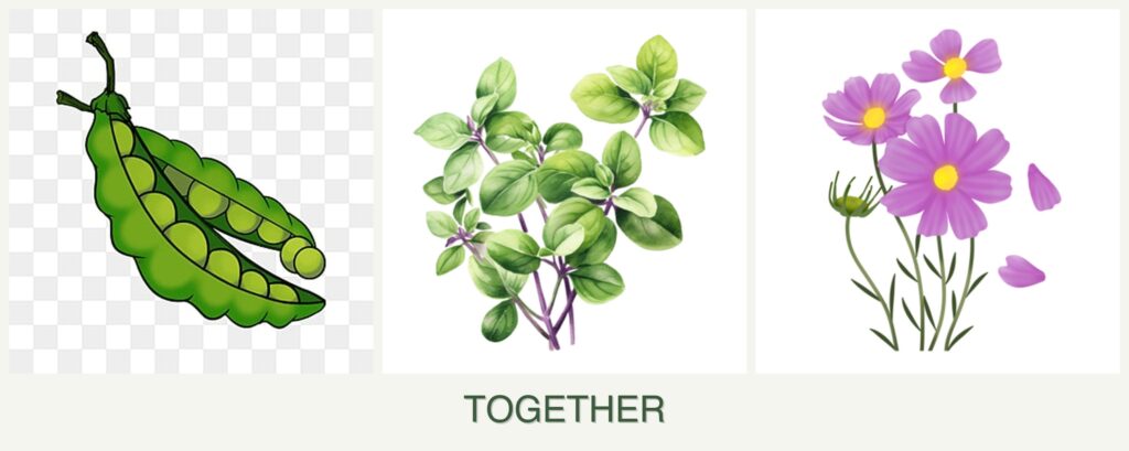 Nutrient Needs: Peas are legumes that fix nitrogen in the soil, enhancing soil fertility for oregano and cosmos. However, ensure that the soil’s nutrient levels are balanced to support all three plants.