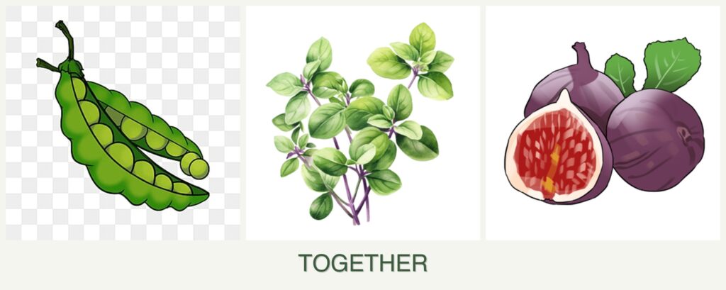 - Nutrient Needs: Peas fix nitrogen in the soil, benefiting figs and oregano, which can use the nutrient-rich soil for better growth.