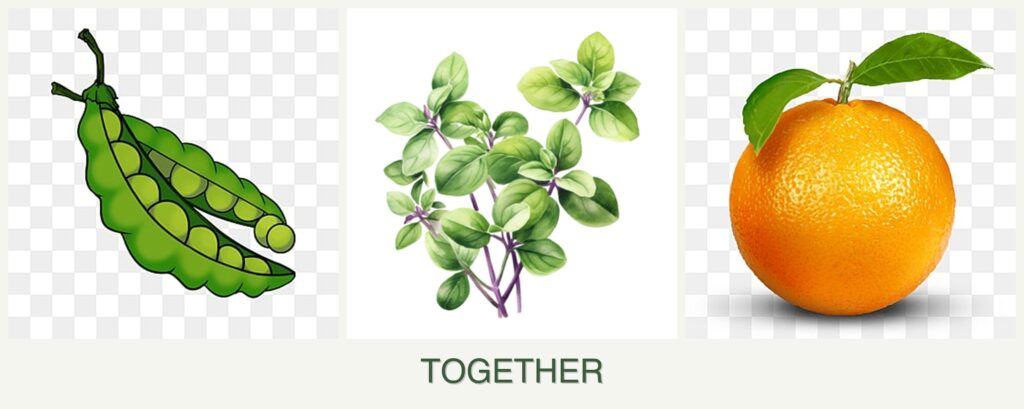 Nutrient Needs and Spacing: Peas are nitrogen-fixing plants, improving soil fertility, which can benefit oregano. However, orange trees have extensive root systems that compete for nutrients and space, making it difficult for peas and oregano to coexist nearby.