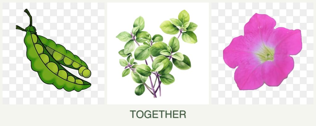 - Pest Control: Oregano’s scent repels certain insects, and petunias can attract pollinators that help peas.