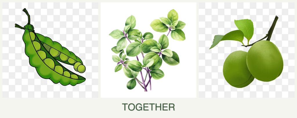 - Soil Health Benefits: Peas fix nitrogen, enriching the soil for oregano and plums.