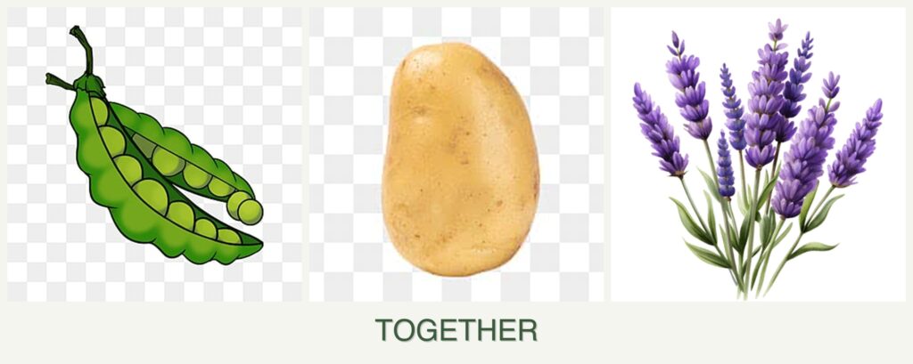 - Optimal Spacing: Keep lavender at the perimeter to ensure its dry conditions. Plant peas and potatoes with proper spacing to prevent crowding.