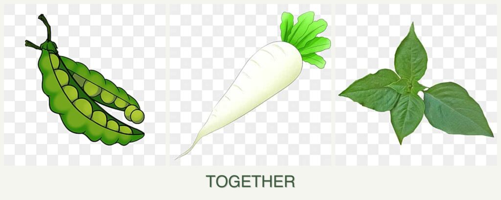 - Nutrient Needs: Peas improve soil nitrogen levels, benefiting the nutrient uptake of radishes and basil.