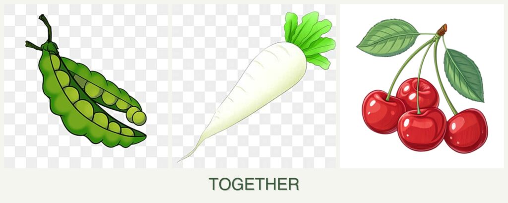 - Growth Requirements: Peas and radishes thrive in cooler seasons and have relatively similar soil and water needs. Cherries, however, are long-term perennials requiring more space, distinct soil conditions, and specific care.