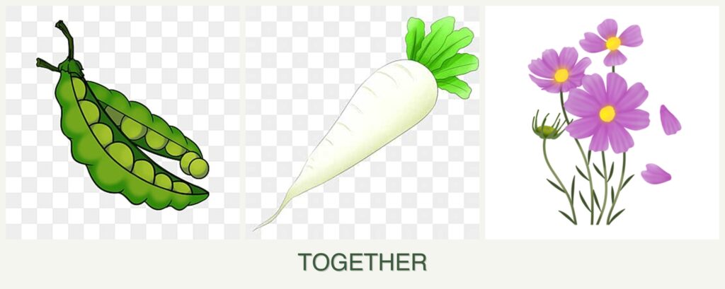 - Nutrient Needs: Peas improve soil nitrogen levels, which benefits radishes and cosmos.