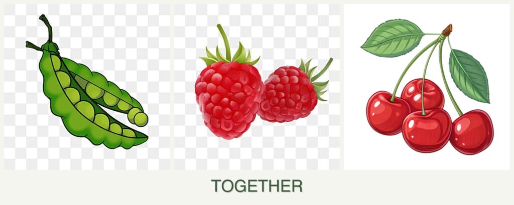 Nutrient Needs: Peas enrich soil nitrogen, which is beneficial for the fruiting plants. However, raspberries and cherries have deeper root systems and may compete for water and nutrients.
