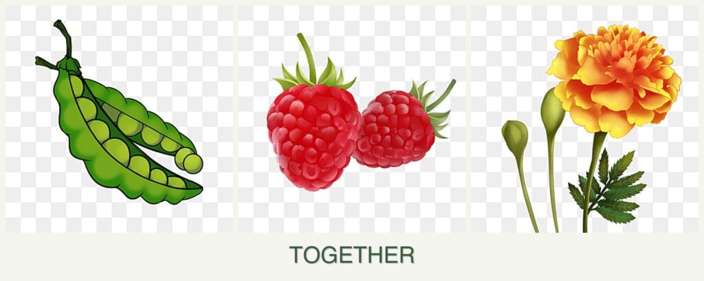 Improved Growth: Peas’ nitrogen-fixing ability enhances soil fertility, promoting robust growth for raspberries and marigolds.
