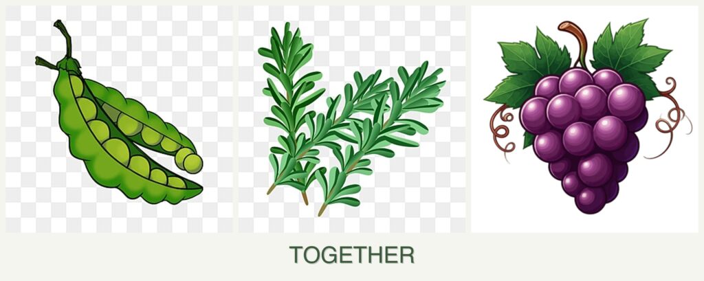 - Nutrient Needs: Peas enrich the soil with nitrogen, which could benefit grapes but is less critical for rosemary.