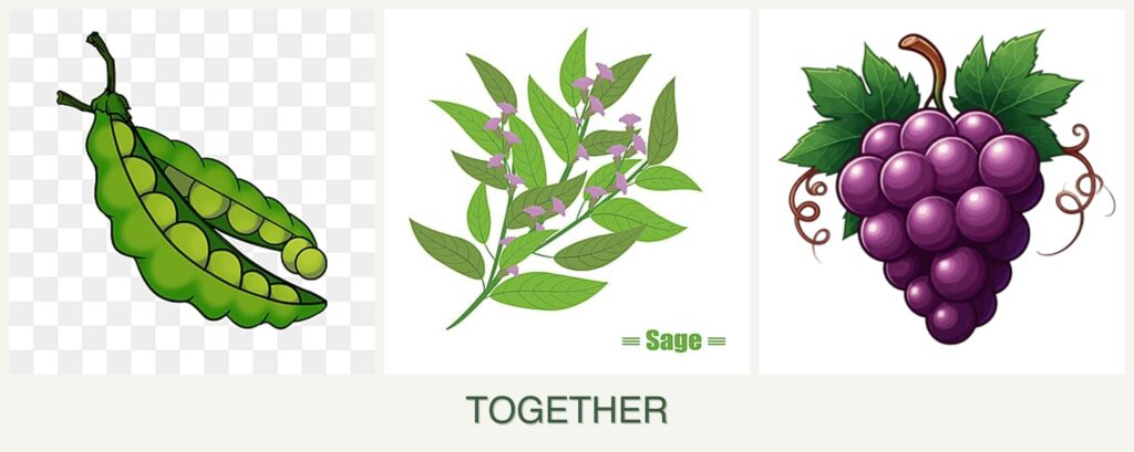 - Spacing: Grapes need ample space to spread, while peas and sage can be planted closer together. Proper spacing ensures each plant receives enough sunlight and air circulation.