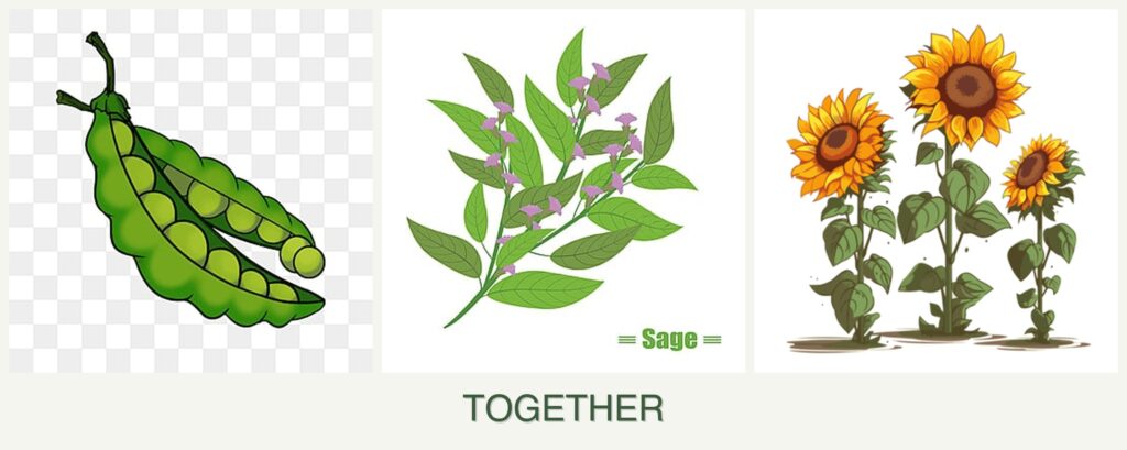 - Nutrient Needs: Peas fix nitrogen, helping to nourish sunflowers, while sage requires minimal nutrients.