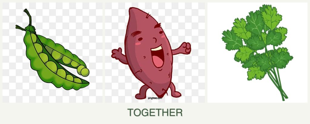 Nutrient Needs: Peas are nitrogen-fixers, enriching the soil for nutrient-hungry sweet potatoes. Cilantro’s shallow roots don’t compete heavily with the others for nutrients.