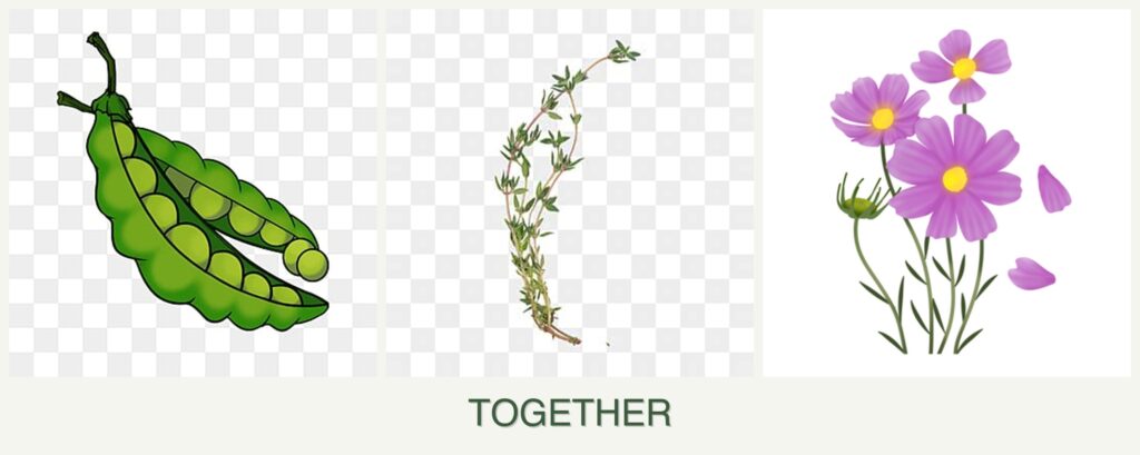 - Improved Growth: Peas enhance soil nitrogen, promoting healthier thyme and cosmos.