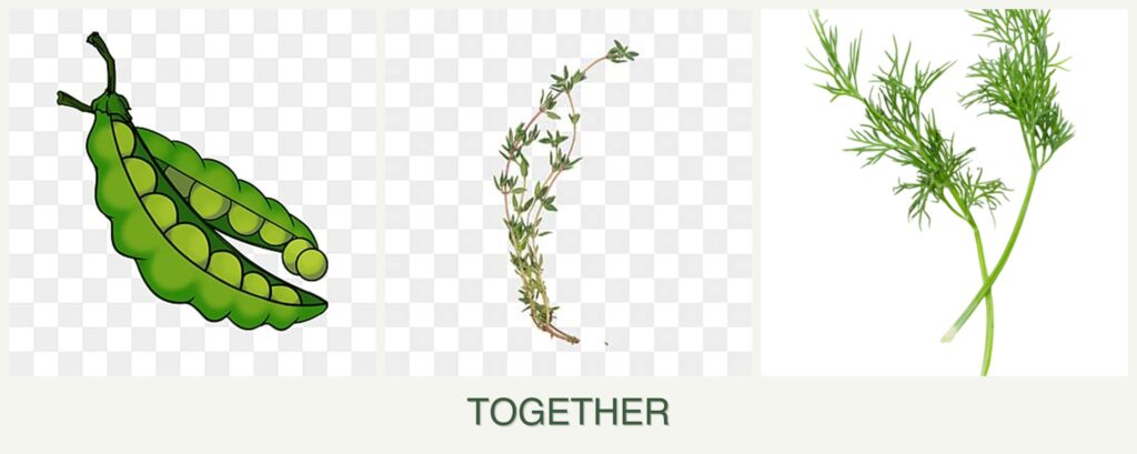 - Soil Health Benefits: Peas fix nitrogen, enriching the soil for thyme and dill.