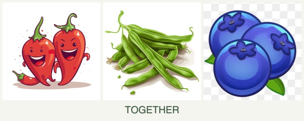 - Nutrient Needs: Beans fix nitrogen in the soil, which benefits peppers but not blueberries due to their preference for acidic conditions.