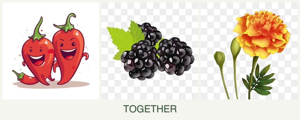 - Growth Requirements: Peppers and marigolds share similar sunlight and soil needs, while blackberries require more space and can tolerate slightly different soil conditions.