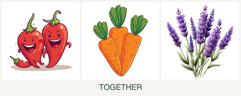 - Nutrient Needs: Peppers and carrots have non-competing nutrient requirements, while lavender’s needs are minimal, reducing competition.