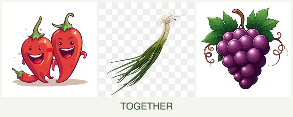 - Growth Requirements: Chives and peppers prefer full sun, while grapes can tolerate partial shade.