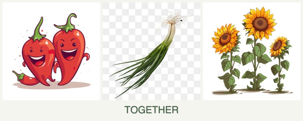 - Different Watering Needs: While chives and peppers have similar water needs, sunflowers may require less frequent watering.