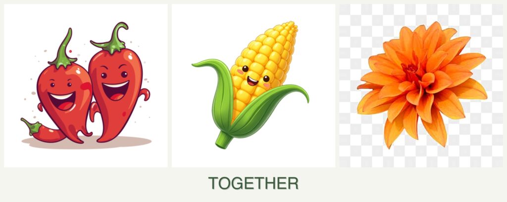 - Growth Requirements: Peppers and corn both thrive in full sun and require similar soil conditions, making them good companions. Dahlias, while also sun-loving, have different spacing needs due to their tuberous roots.