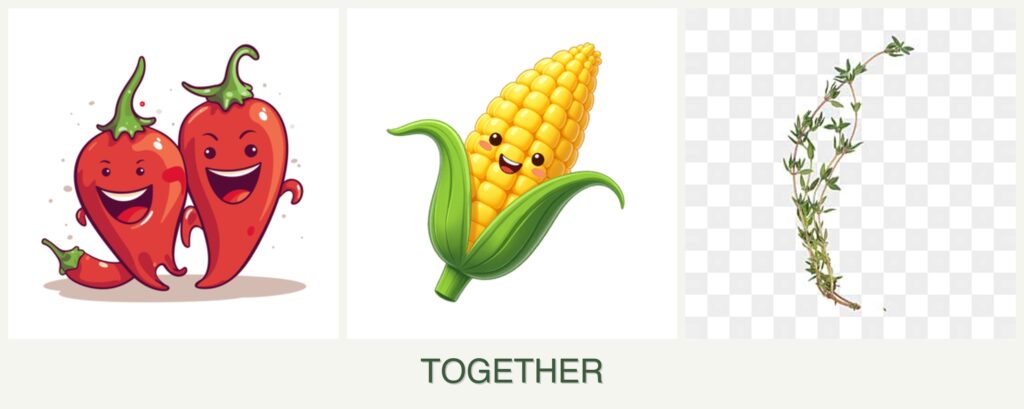 Pest Control: Corn can serve as a living trellis for peppers, while thyme’s aromatic oils can repel certain pests, offering a natural pest management solution.