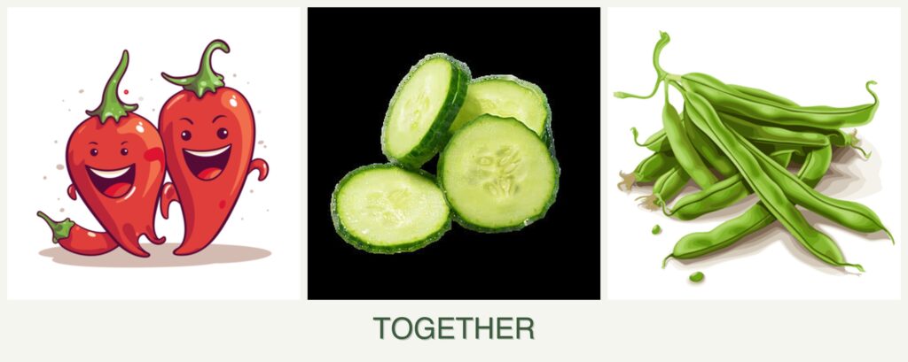 - Pest Control: Beans can repel certain pests that affect peppers and cucumbers, while cucumbers’ sprawling habit can shade the soil, reducing weed growth.
