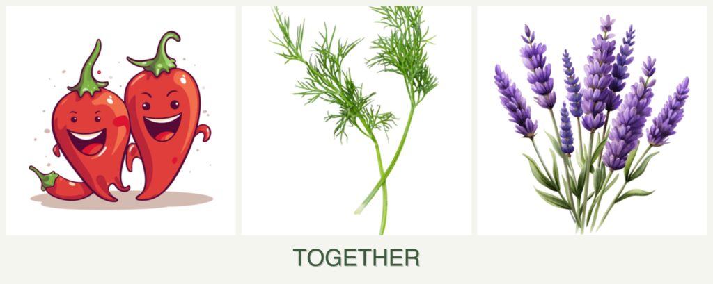 - Nutrient Needs: All three plants have moderate nutrient needs, but lavender is more tolerant of poorer soil, which might affect its compatibility with the nutrient-rich needs of peppers and dill.