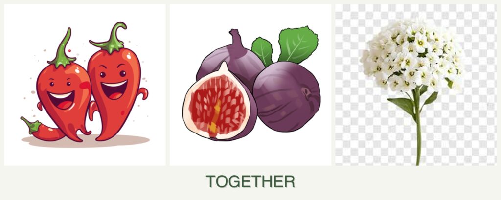 - Nutrient Needs and Spacing: Peppers and alyssum have similar soil nutrient requirements, but figs need more space due to their size. Proper spacing ensures they don’t compete excessively for resources.